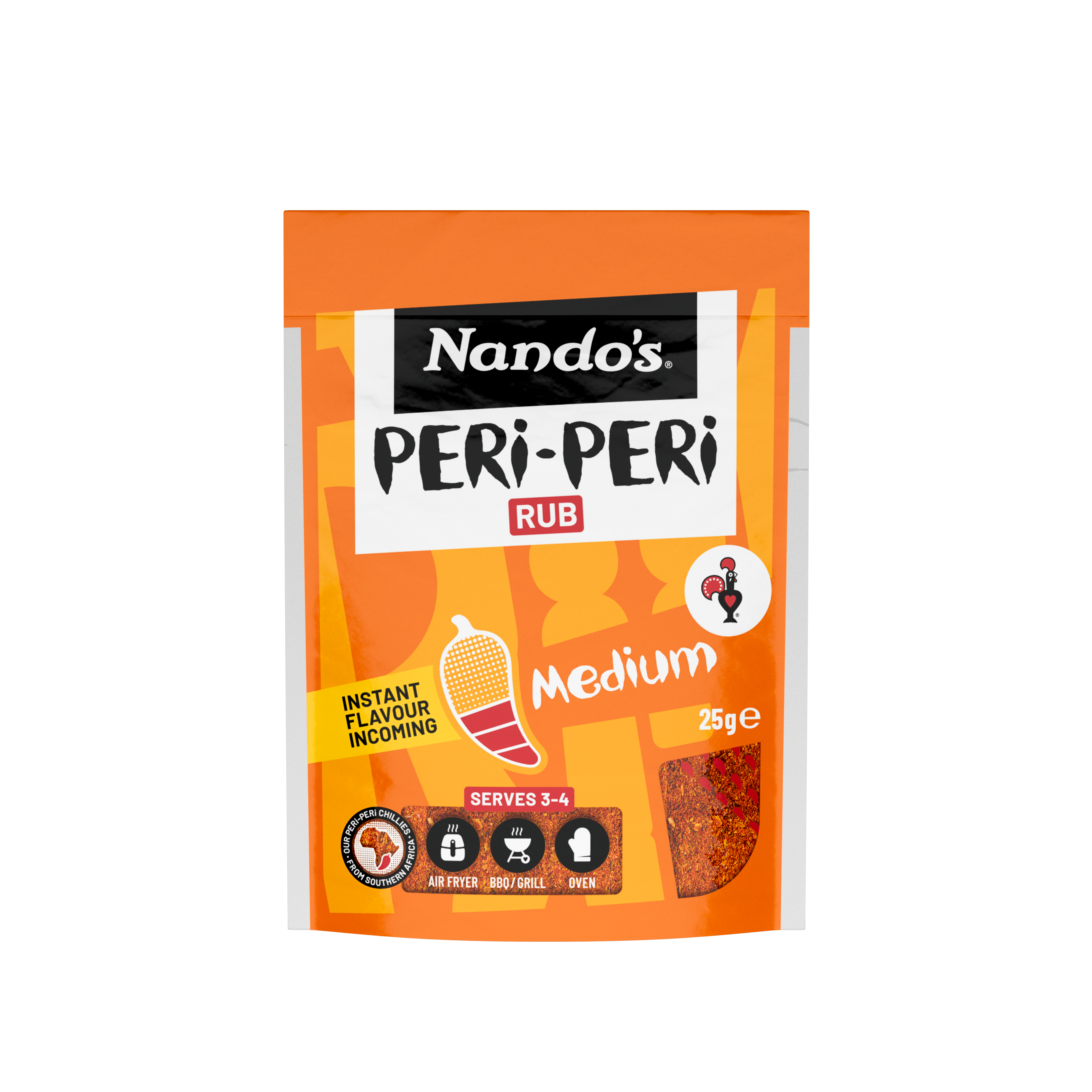 • Nando's Medium Peri Peri Rub is a delicious seasoning of garlic, herbs and spices with Peri Peri to flavour your meat